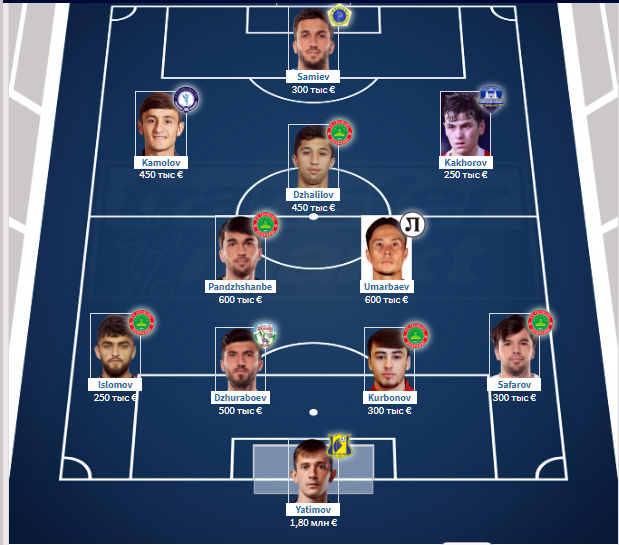В общем, стоимость состава самых дорогих 11 игроков — 5,80 млн €. 5 стран выступления: Россия, Таджикистан, Узбекистан, Болгария, Иран. Баланс опыта и молодости: от 18 до 32 лет. Это — фундамент сборной Таджикистана как в настоящем, так и в ближайшем будущем.