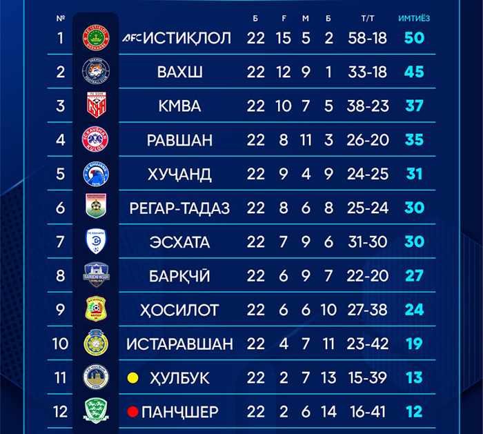 На дне таблицы — два вылетевших клуба. «Истаравшан» Шухрата Шамсиева (19 очков) не удержался в элите после серии неудач. «Хулбук» (13) и «Панджшер» (12), несмотря на отдельные яркие игры, покидают высшую лигу, став худшими в обороне и владении мячом.