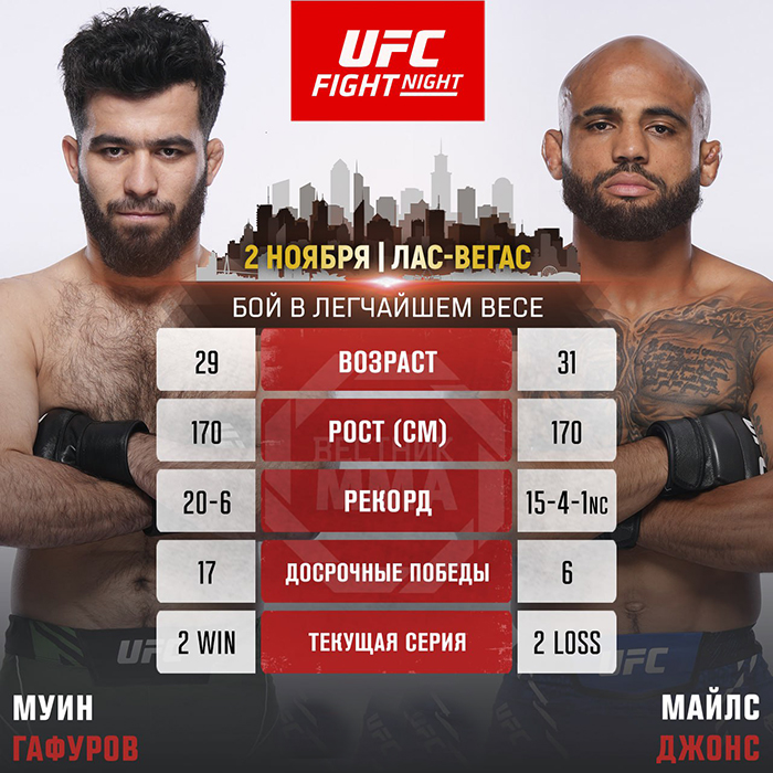 Муин Гафуров из Таджикистана (20-6, UFC 2-2) сойдётся в октагоне с опытным американцем Майлсом «Чапо» Джонсом (15-4-1NC, UFC 6-4-1NC).