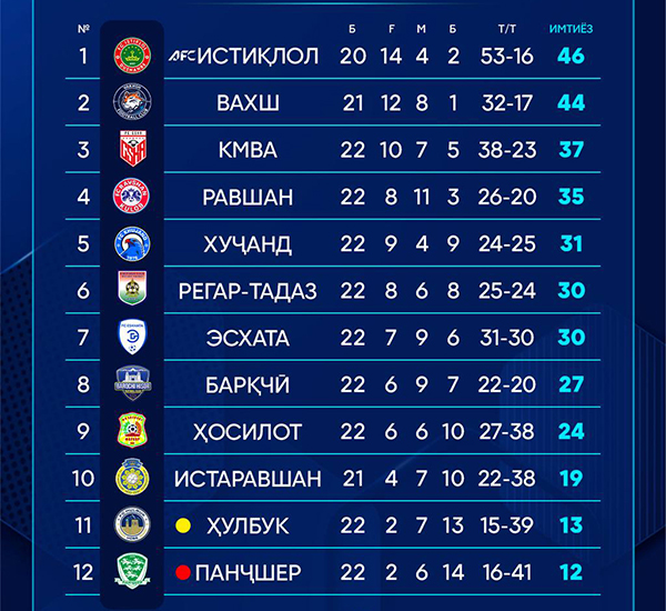 ДУШАНБЕ, декабрь — SPORTS.tj. До завершения сезона осталось всего два отложенных матча — «Вахш» vs «Истиклол» (8 декабря) и «Истаравшан» vs «Истиклол» (12 декабря).