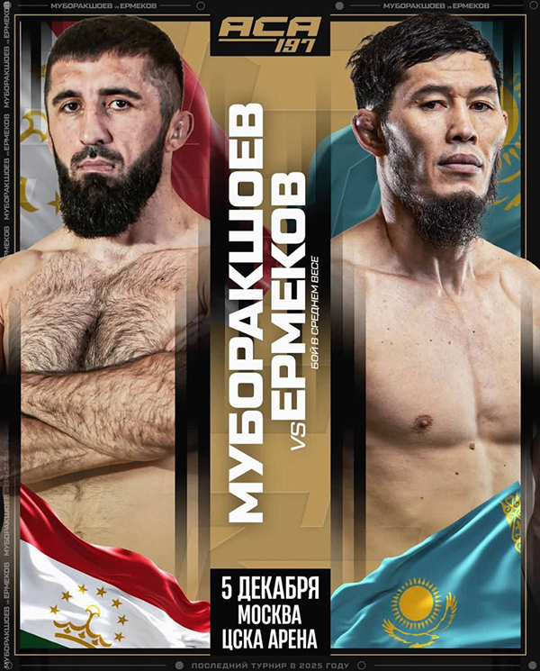 ДУШАНБЕ, ноябрь — SPORTS.tj. Казахстанский боец Даурен Ермеков (20-7) и представитель Таджикистана Муборакшо Муборакшоев (8-0) проведут поединок 5 декабря в рамках турнира ACA 197 в Москве.
