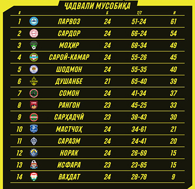 Вторым в чемпионате продолжает идти «Сардор» — 54 очка, на третьем месте – «Мохир» (49 баллов).