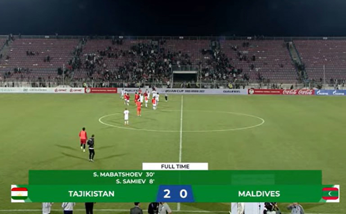 Этот быстрый гол снял напряжение и позволил хозяевам играть спокойнее. Спустя двадцать минут преимущество удвоил Шервони Мабатшоев, добив мяч после ошибки вратаря Мальдив Мохамеда Файсала — 2:0.