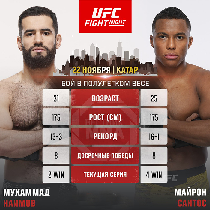 ДУШАНБЕ, октябрь — SPORTS.tj. 22 ноября в Дохе (Катар) на арене ABHA Arena состоится бой, который обещает стать одним из самых интригующих событий осени — таджикский боец Мухаммад Наимов (13–3, UFC 5–1) встретится с бразильским файтером Майроном «Легендой» Сантосом (16–1, UFC 3–0).