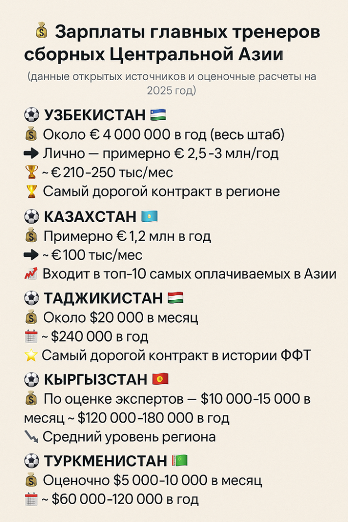 💰 Зарплаты главных тренеров сборных Центральной Азии 🇰🇬🇹🇯🇺🇿🇰🇿🇹🇲